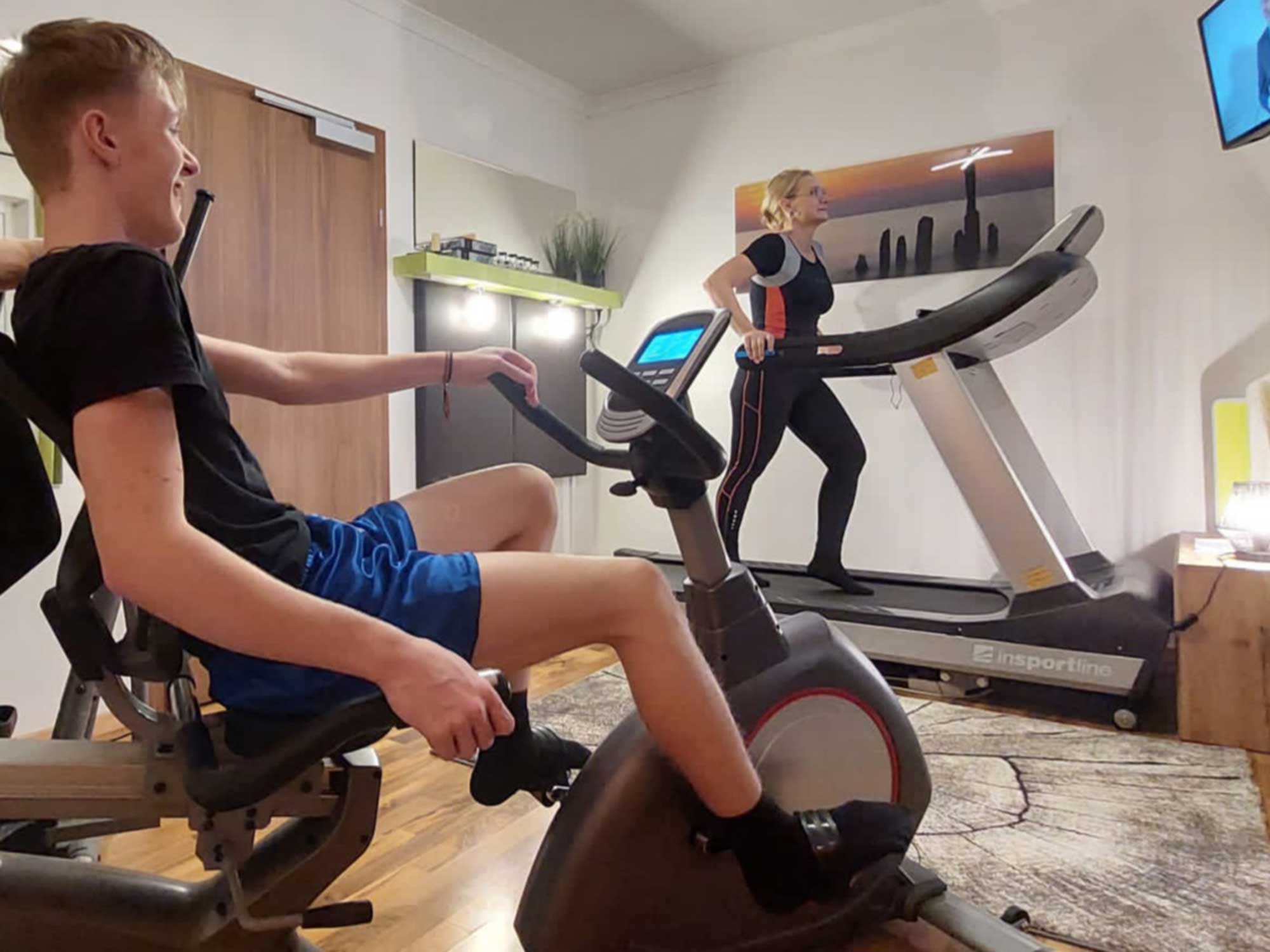 - Infrarotsaune, finnisches Saunafass & kleiner Fitnessraum